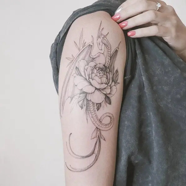 A dragon with a rose tattoo indicates fiery passion. Rose adds a sense of love and passion to the dragons who are known to be intensively powerful and strong.