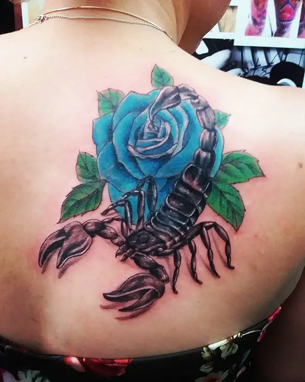 Want to add vibrant color to your black and white scorpion tattoo? This blue rose and the dark green leaves are a perfect addition to it, which symbolizes mystery and your desire to attain the impossible.
