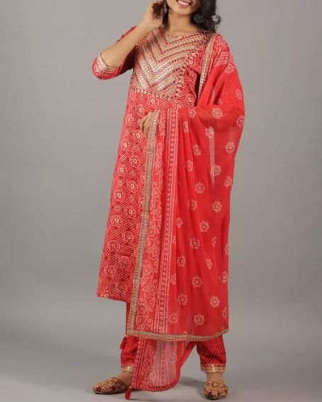 This is a long red bandhani kurti with a round neck design and a golden print creating a striking and elegant outlook. The round neck of a fancy bandhani kurti adds a classic touch, making it a versatile and fashionable choice for various occasions.