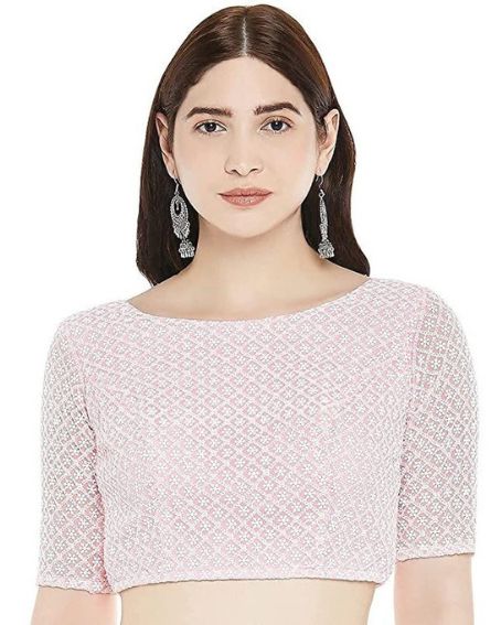 Baby pink and white gota work boatneck blouse is so romantic and very pretty. An all-over white gota work blouse in famous boatneck style with quarter sleeves. Sophisticated in style, but always so simple.