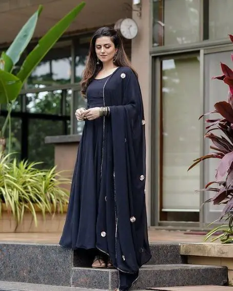 This is a plain black anarkali kurti with full sleeves and a round neckline. It is worn with a chuddi pant pant and a georgette fabric dupatta with a golden lace border. This is the best option for gatherings, dinners, and get together parties.