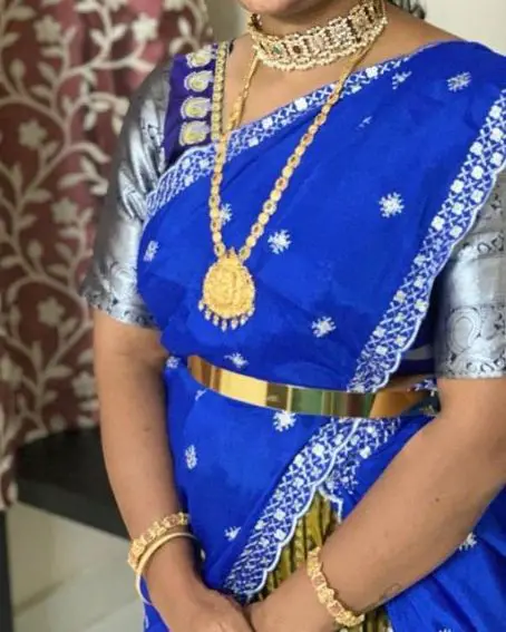The stylish and traditional pattu blouse with computer design can eventually take your whole look to another level. This beautiful sandal is matched with a contrasting blue pattu saree with a zari border.