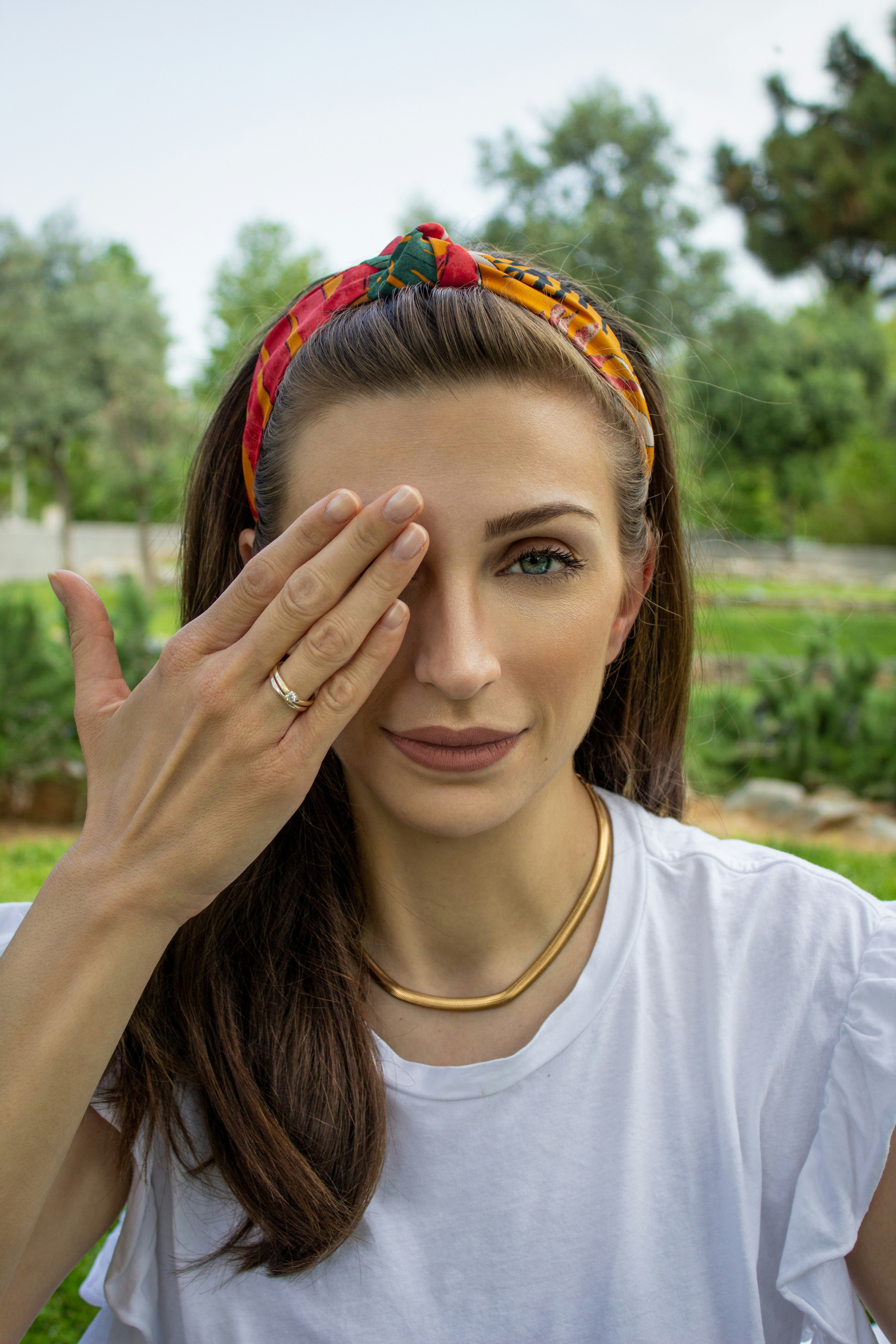 plastic hairband to keep her hair neatly in place during the outdoor event