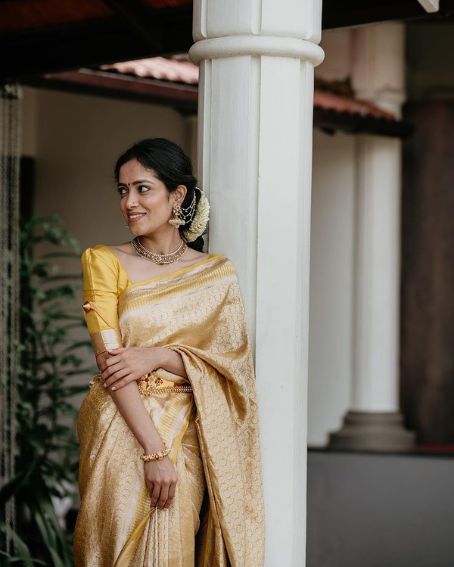 Radiant gold tissue sarees cater to the preferences of women, young girls, and teenagers attending wedding events. These sarees are designed to create a stunning guest look that appeals to different age groups.