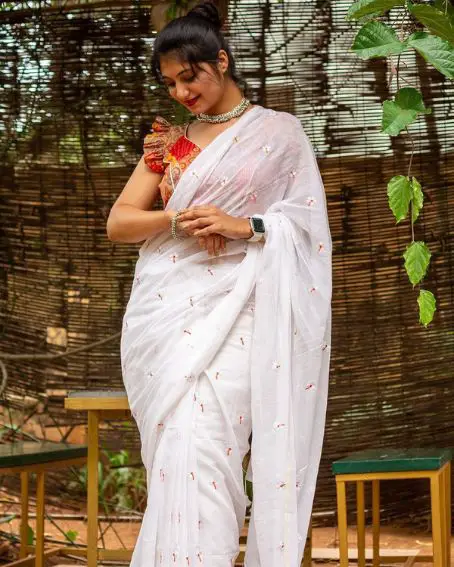 White sarees with different colored blouses give you so many fashion options for all kinds of events. Whether you like classic styles, modern looks with black, or vibrant colors like pink, orange, and red, white sarees are like a blank canvas ready to match your mood and the occasion. They’re perfect for weddings, festivals, casual get-togethers, and fancy parties. No wonder women of all ages love these versatile and timeless outfits.