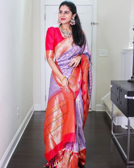 A violet Banarasi saree with a pink blouse is a traditional ensemble that appeals to women and young girls who appreciate timeless patterns and craftsmanship. This combination is well-suited for festive occasions and cultural festivals, embodying the richness of Indian heritage while offering a graceful appearance across different age groups.